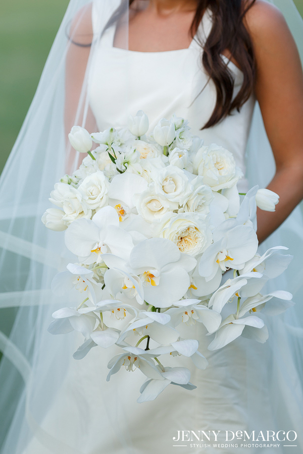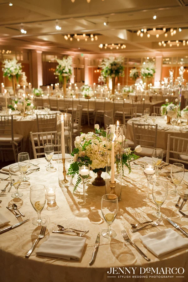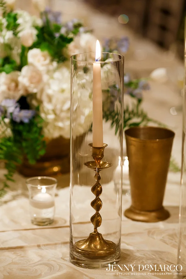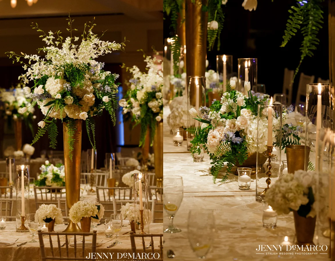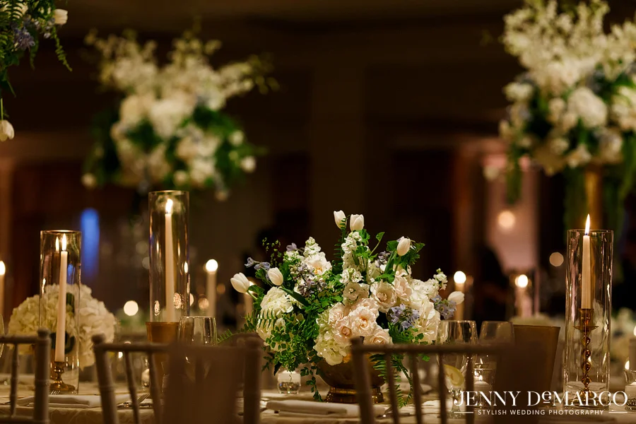 Lanier and Andrew had a simple, classically beautiful ceremony followed by an over-the-top reception covered in lush flowers and glowing in candlelight. Creamy hydrangea, tulips and roses were brought to life by clusters of fern and light blue delphinium. Ivory dendrobium orchids were added to the tall centerpieces for a truly dramatic look throughout the room. In any direction, guests were surrounded by unique centerpieces and wowed by crystal candelabras and elegant taper candles sparkling in glass cylinders. With gorgeous and one-of-a-kind details, this wedding was like a dream from start to finish!