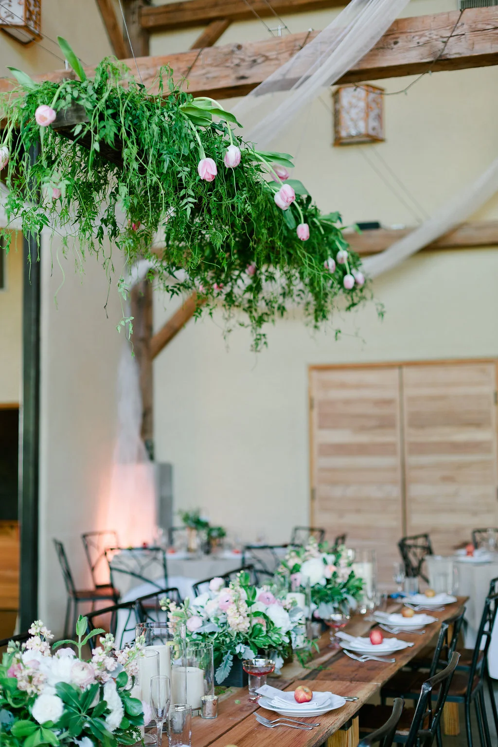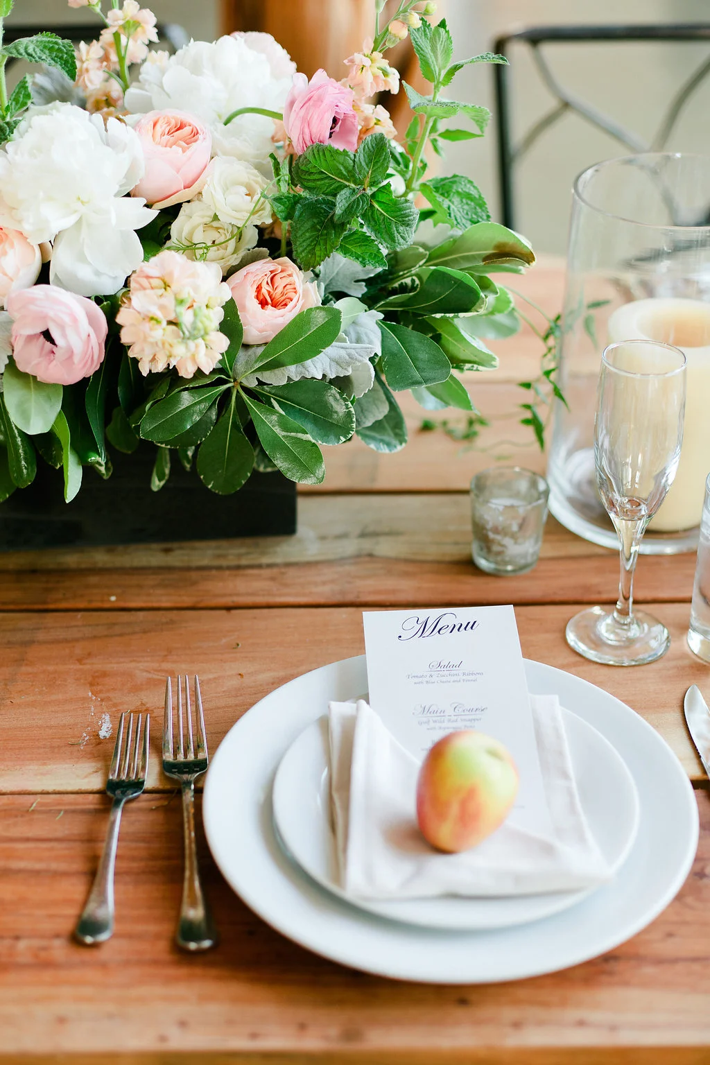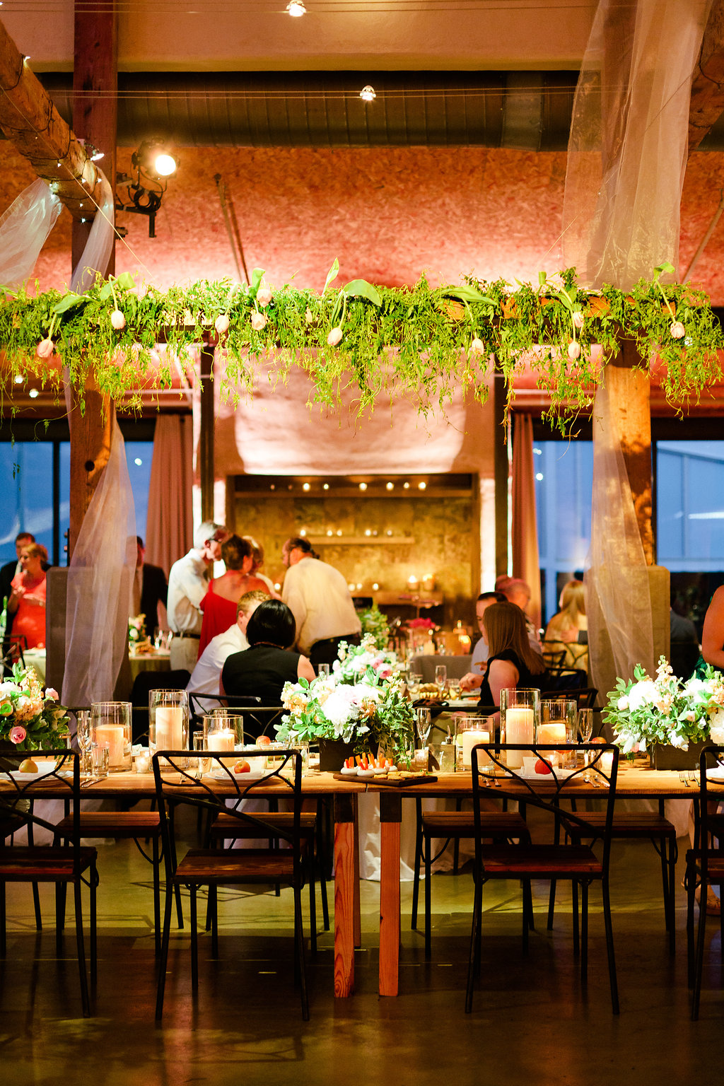 Hill country chic meets lush, secret garden for Shea and Bert's Barr Mansion wedding. With a custom ceiling installation dripping with bright green jasmine vine accented by natural wood boxes filled with peachy garden roses and crisp white peonies this wedding was the perfect combination of casual and elegance. Stunning, thoughtful details accented the romantic theme with vintage pink champagne glasses and the perfect shade of apple at each place setting. Seating assignments were displayed on an antique french door and windows outside the ballroom and custom chalkboards were used for the bar menu, candy station and welcome sign. Vintage details and soft, lush blooms made for the perfect springtime wedding.