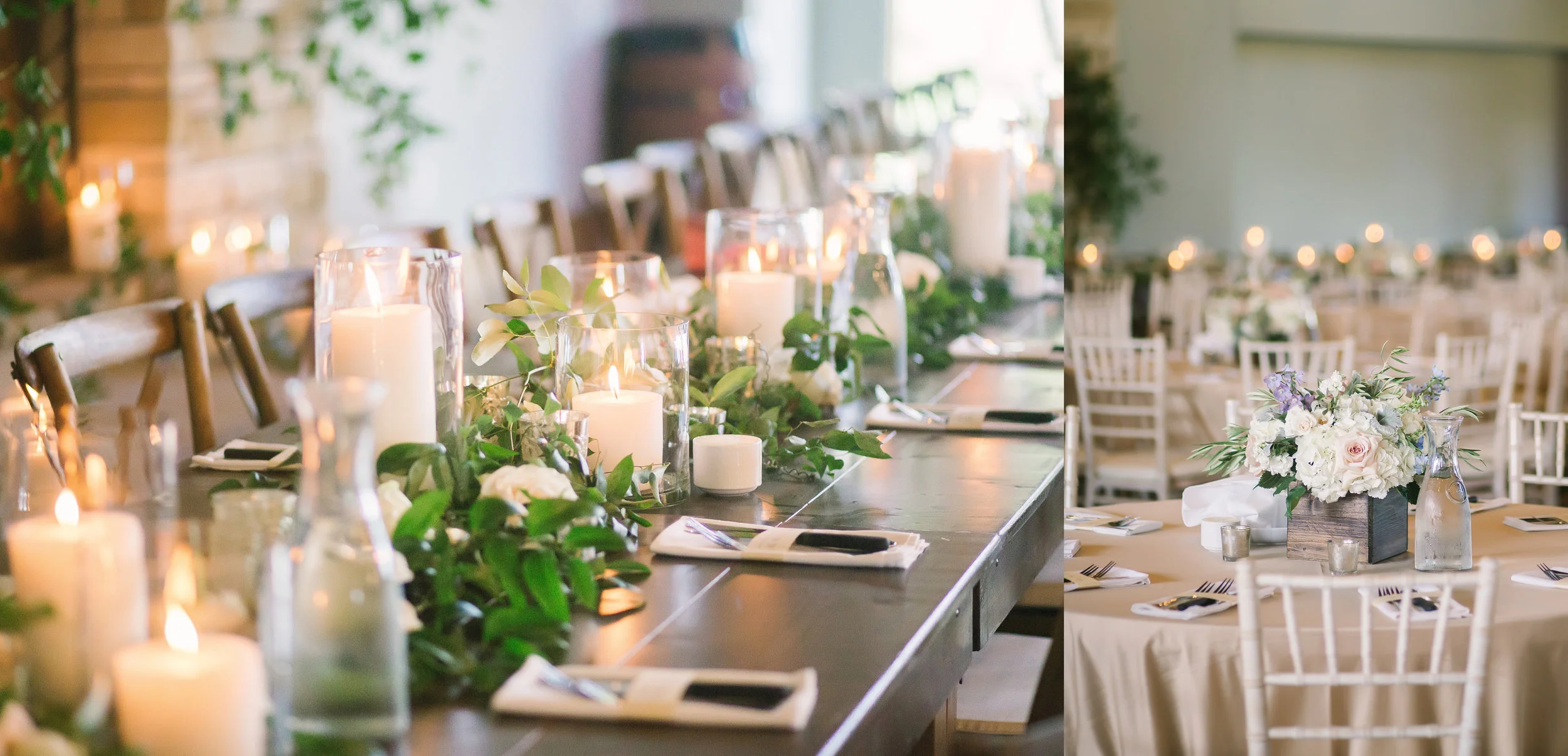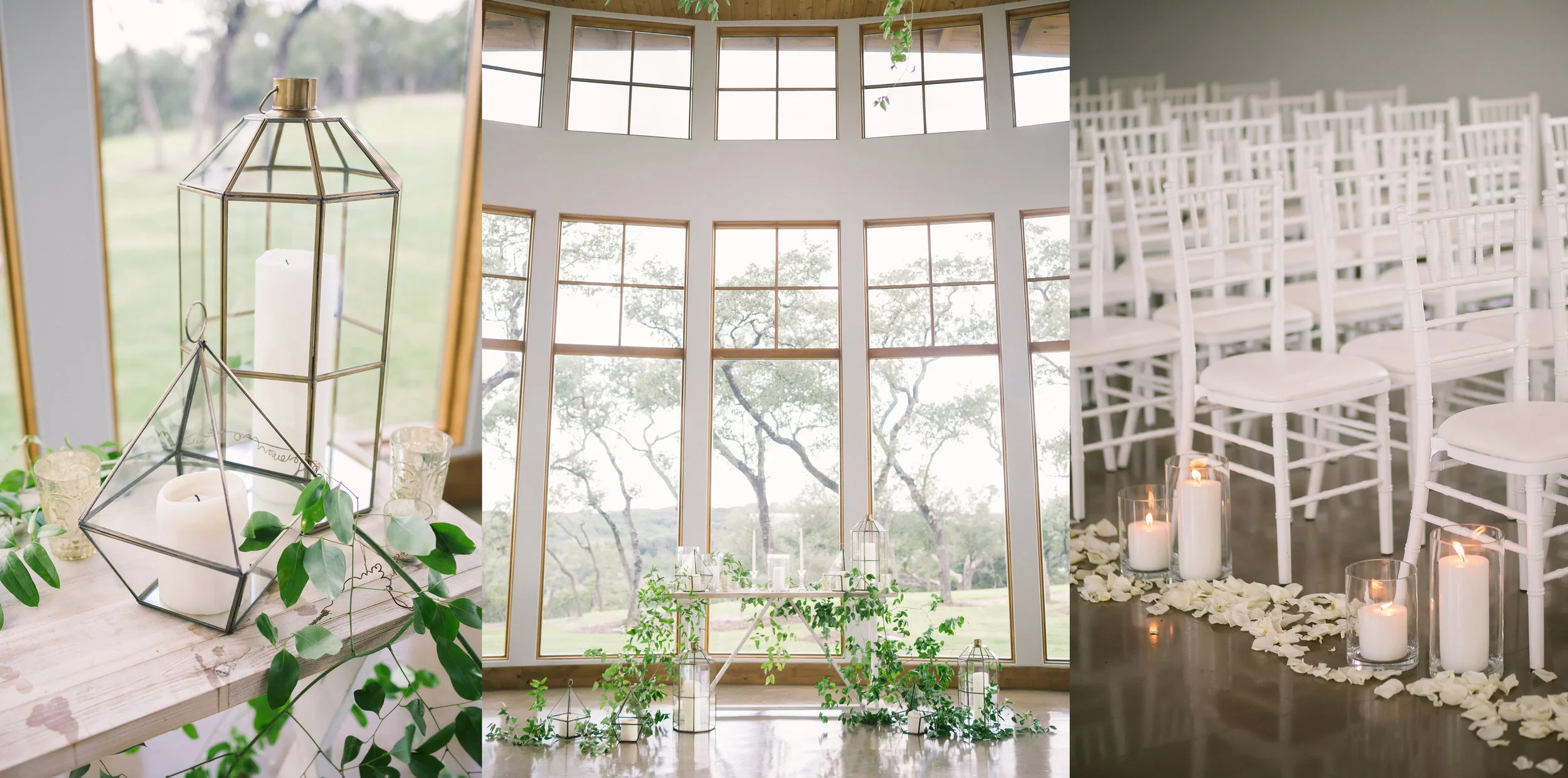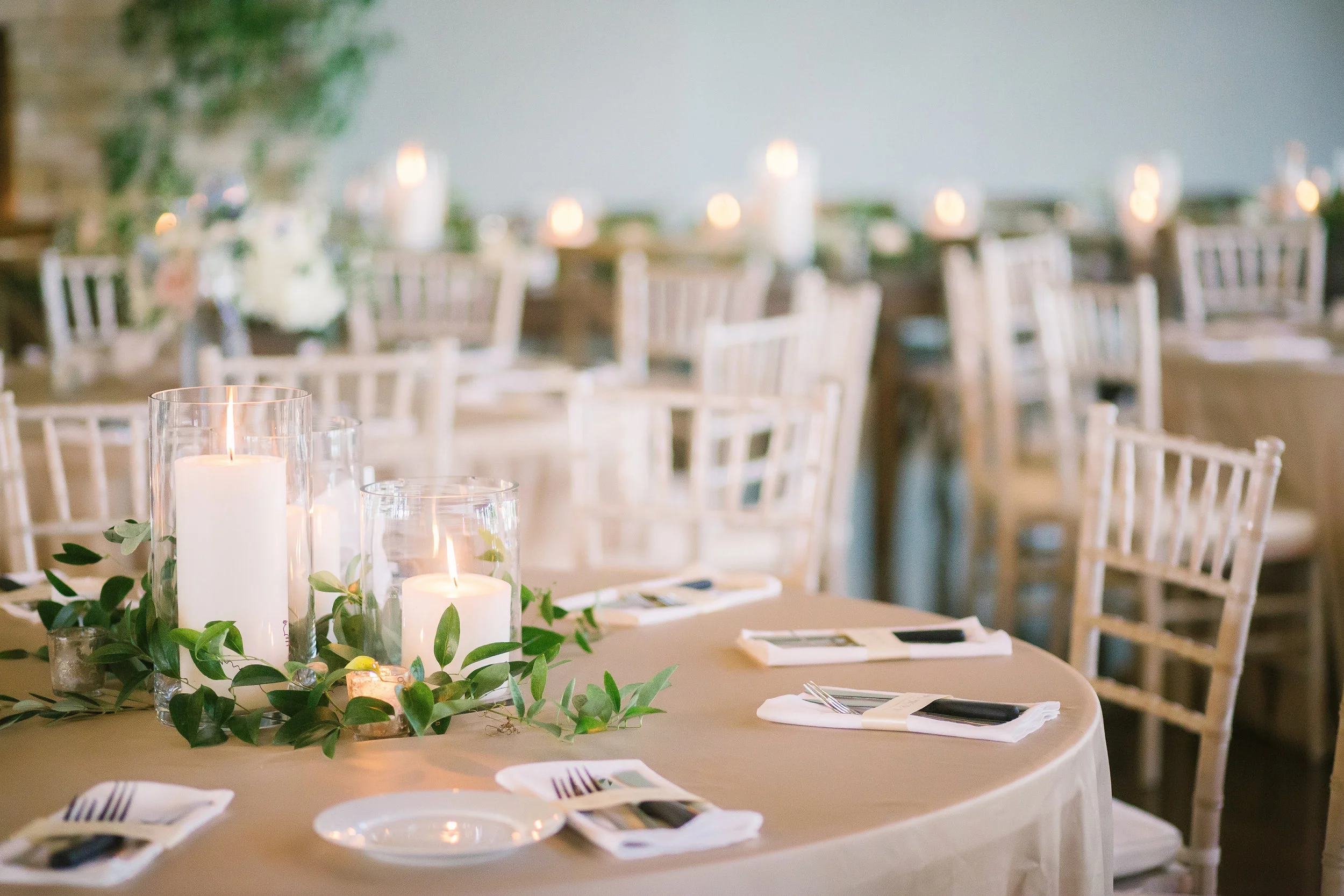 If you're obsessed with candlelight, flowing greenery and soft neutral blooms- prepare to be inspired by Chelsea + Bryan's wedding. They were married in a ceremony space filled with golden natural light, countless candles and ivory rose petals in front of an altar covered in wild smilax vine and varied geometric shapes. The reception was decorated with even more more glowing candles and sprawling vines accented by the very neutral champagne satin linens. Too add even more romance into this day, Chelsea + Bryan revisited their ceremony site at the end of the night for one seriously romantic photo op.