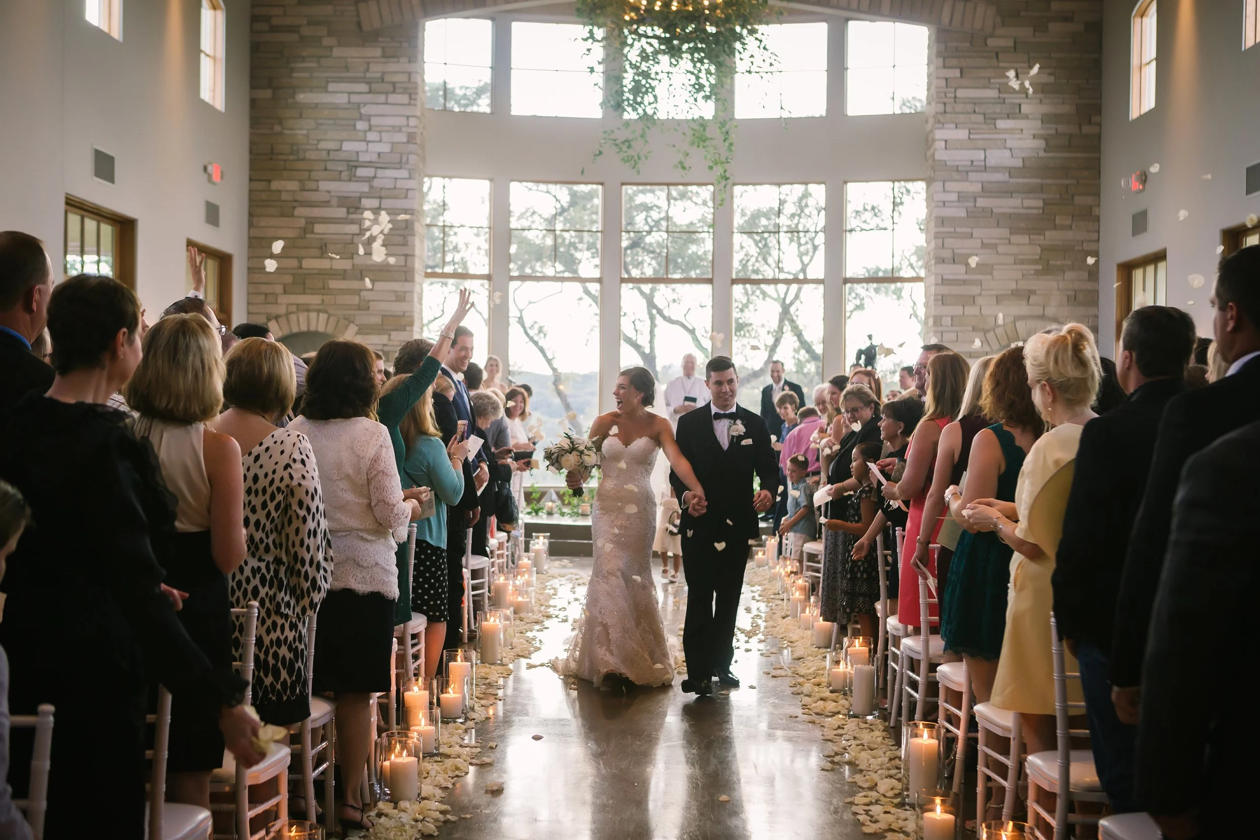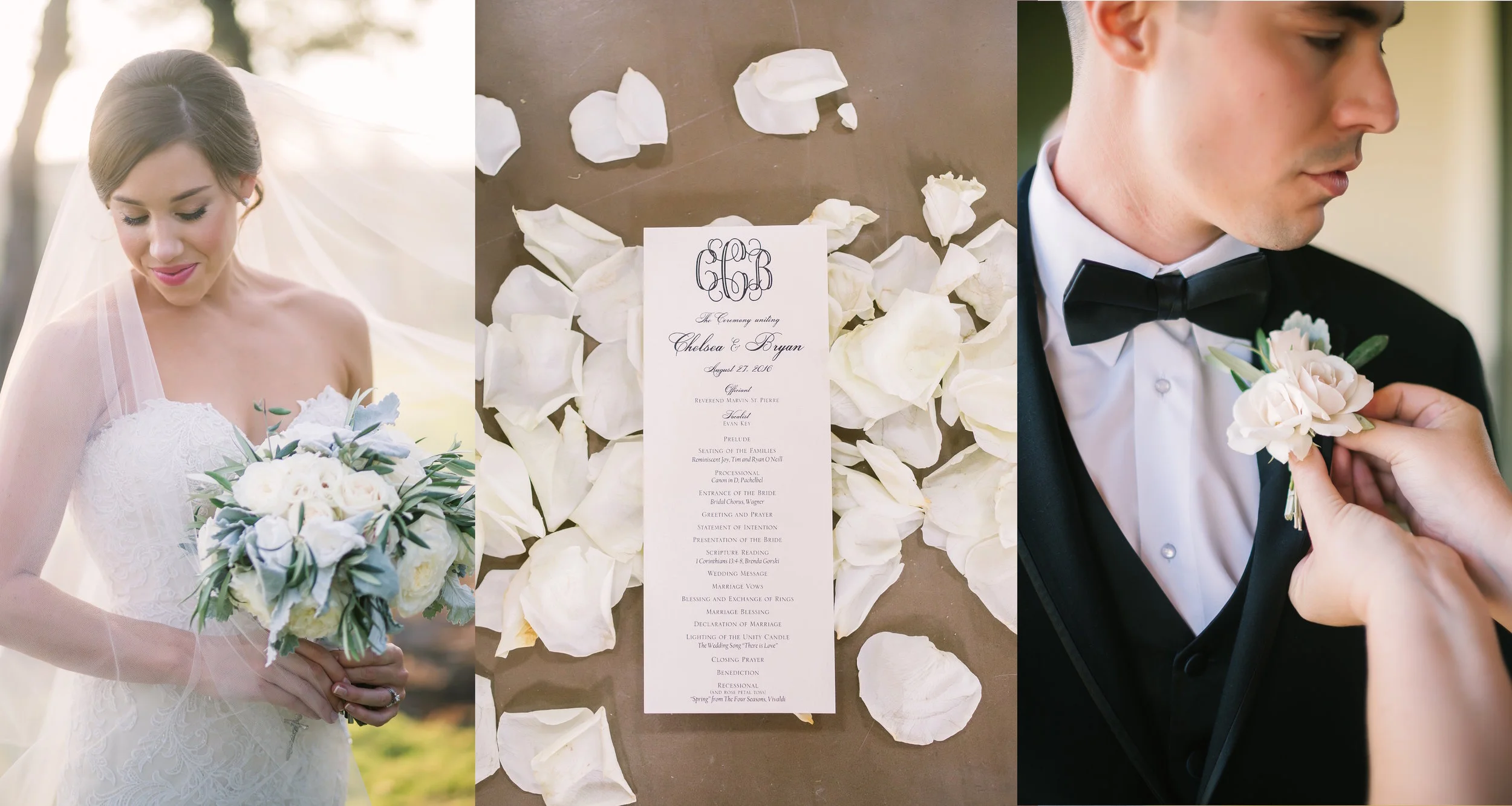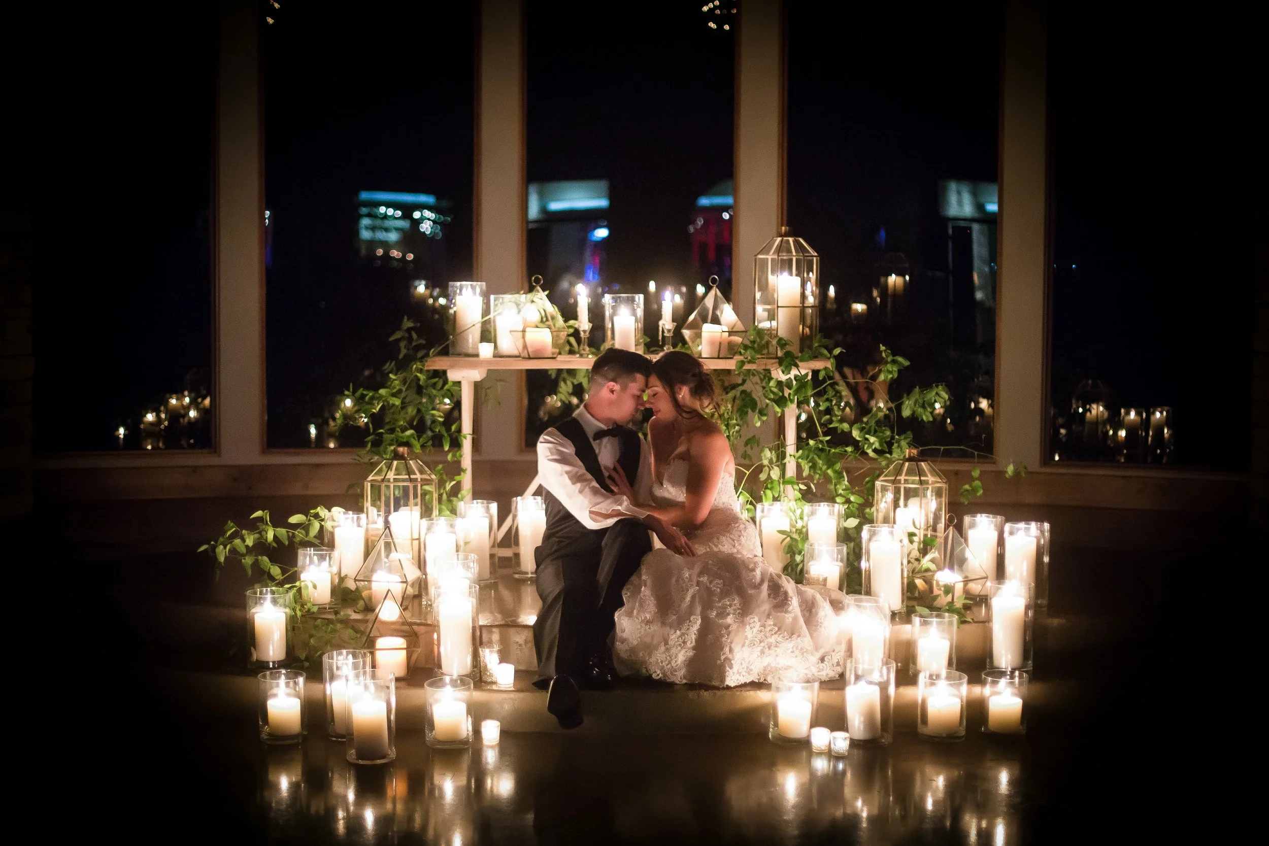 If you're obsessed with candlelight, flowing greenery and soft neutral blooms- prepare to be inspired by Chelsea + Bryan's wedding. They were married in a ceremony space filled with golden natural light, countless candles and ivory rose petals in front of an altar covered in wild smilax vine and varied geometric shapes. The reception was decorated with even more more glowing candles and sprawling vines accented by the very neutral champagne satin linens. Too add even more romance into this day, Chelsea + Bryan revisited their ceremony site at the end of the night for one seriously romantic photo op.