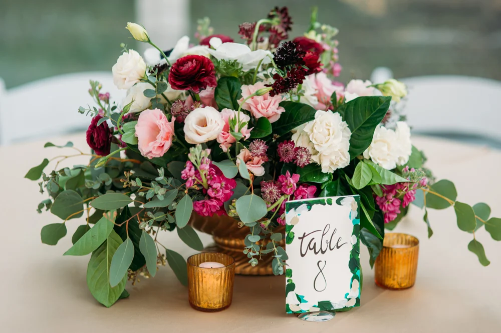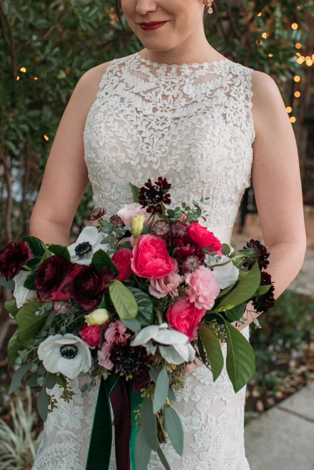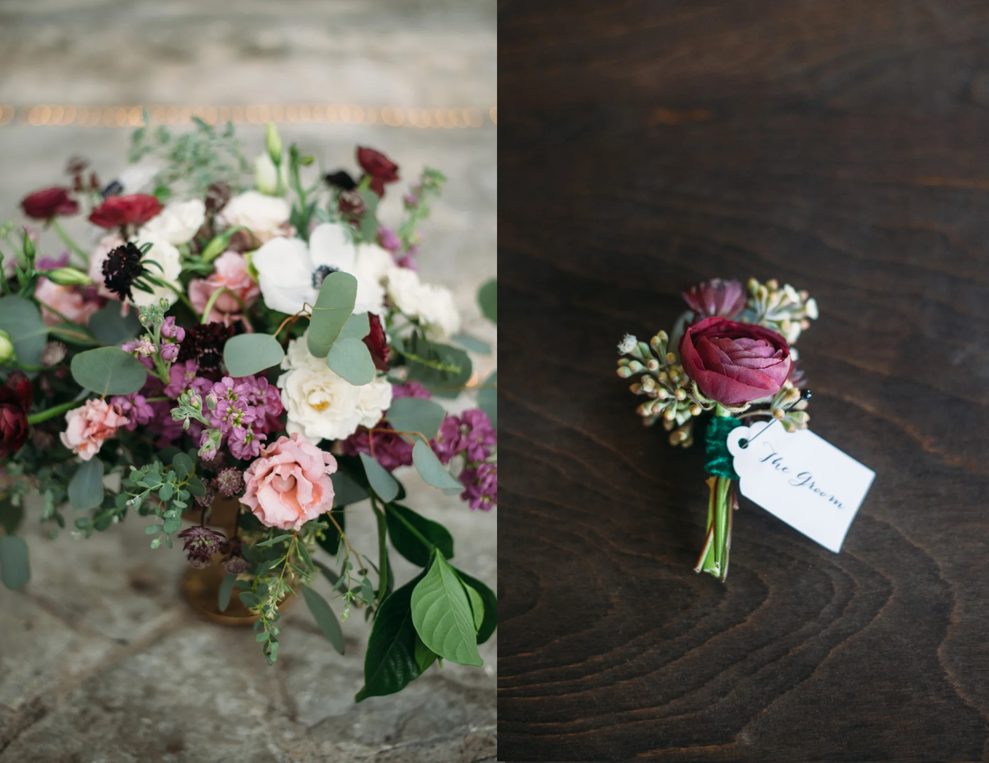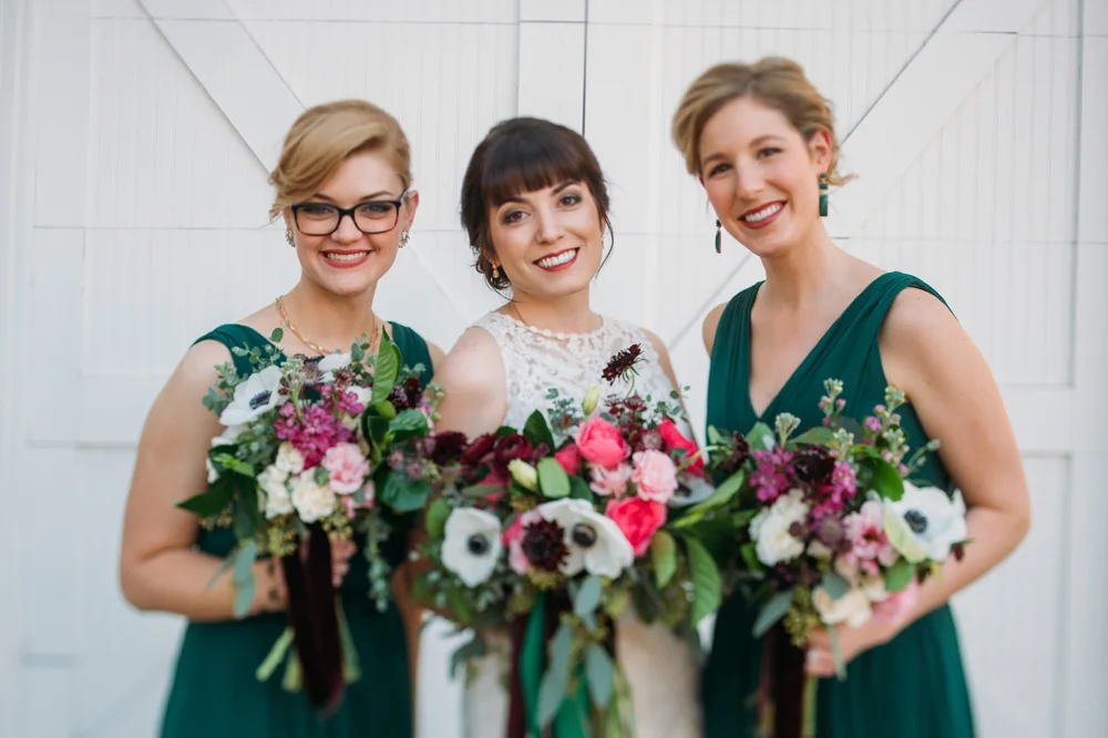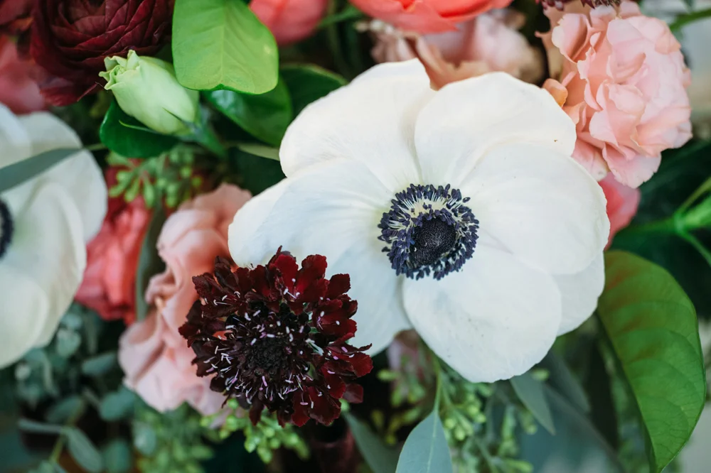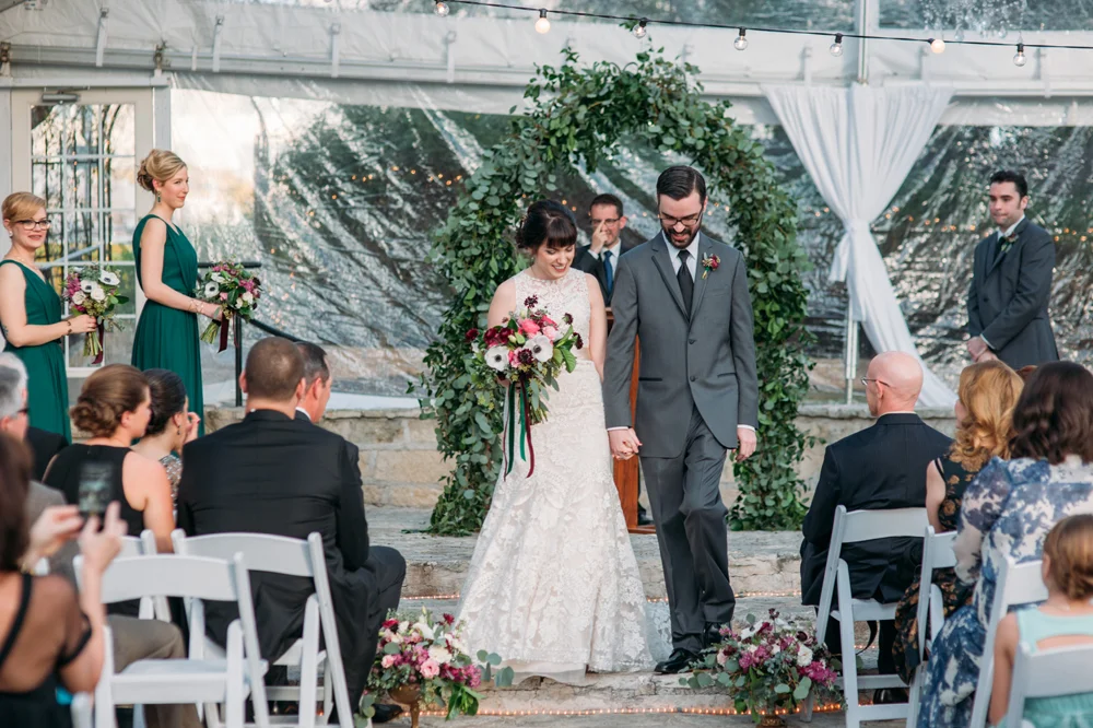They say everything is bigger in Texas, and that includes the locally-grown anemones from Bailey + Jordan's wedding. Mixed metallics, rich jewel tones, show-stopping anemones and emerald green accents made this couple's special day stand out at Allan House. The ceremony archway, heavily decorated with dark green foliage, served as a focal point throughout the night bringing drama to the etherial, clear tent. Pops of lighter pink brought softness to the burgundy blooms and heavy greenery throughout the design. And be sure to check out the custom water color table numbers inspired by the couple's stationary!