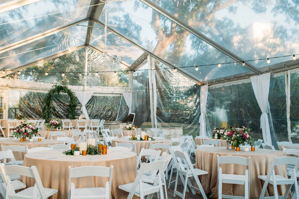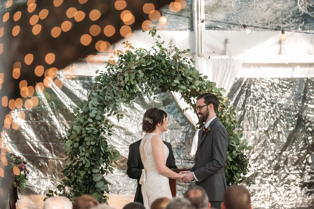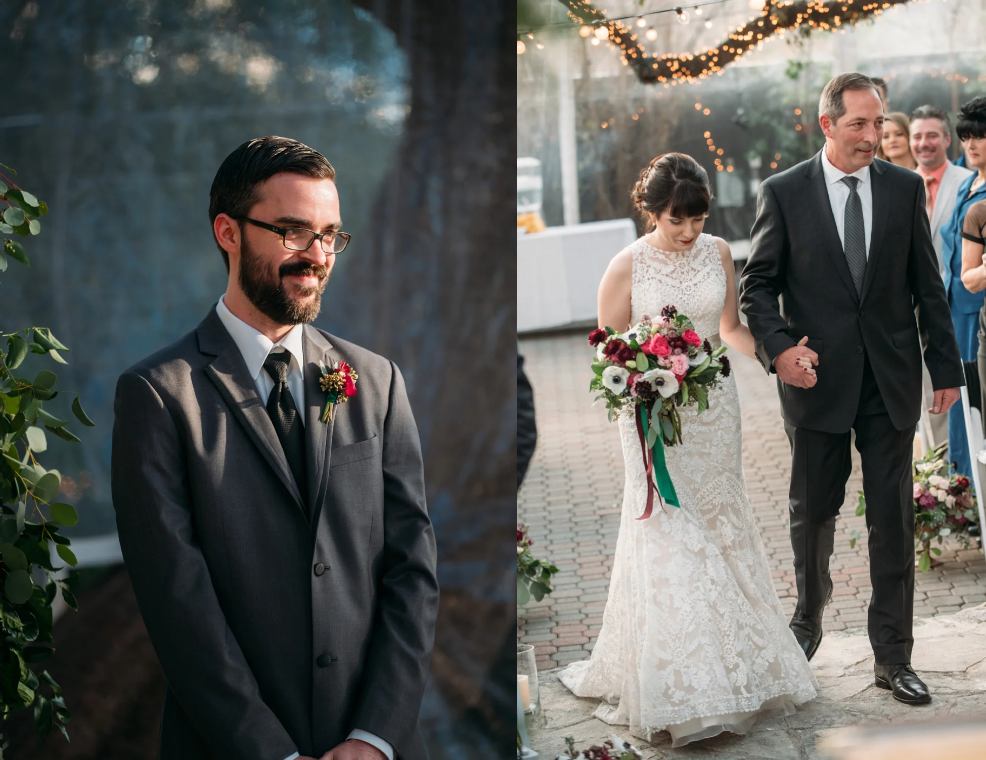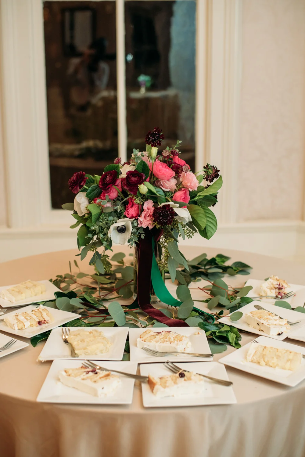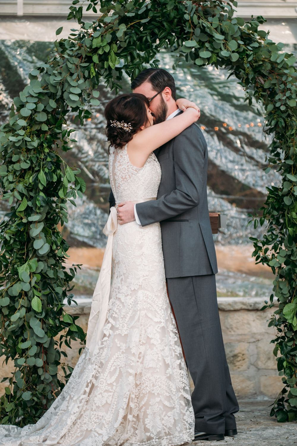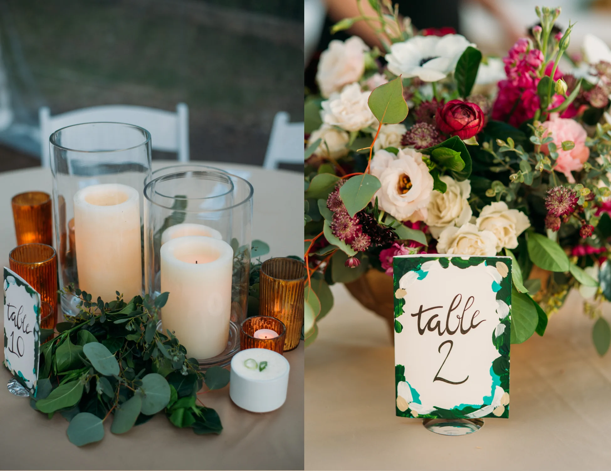 They say everything is bigger in Texas, and that includes the locally-grown anemones from Bailey + Jordan's wedding. Mixed metallics, rich jewel tones, show-stopping anemones and emerald green accents made this couple's special day stand out at Allan House. The ceremony archway, heavily decorated with dark green foliage, served as a focal point throughout the night bringing drama to the etherial, clear tent. Pops of lighter pink brought softness to the burgundy blooms and heavy greenery throughout the design. And be sure to check out the custom water color table numbers inspired by the couple's stationary!