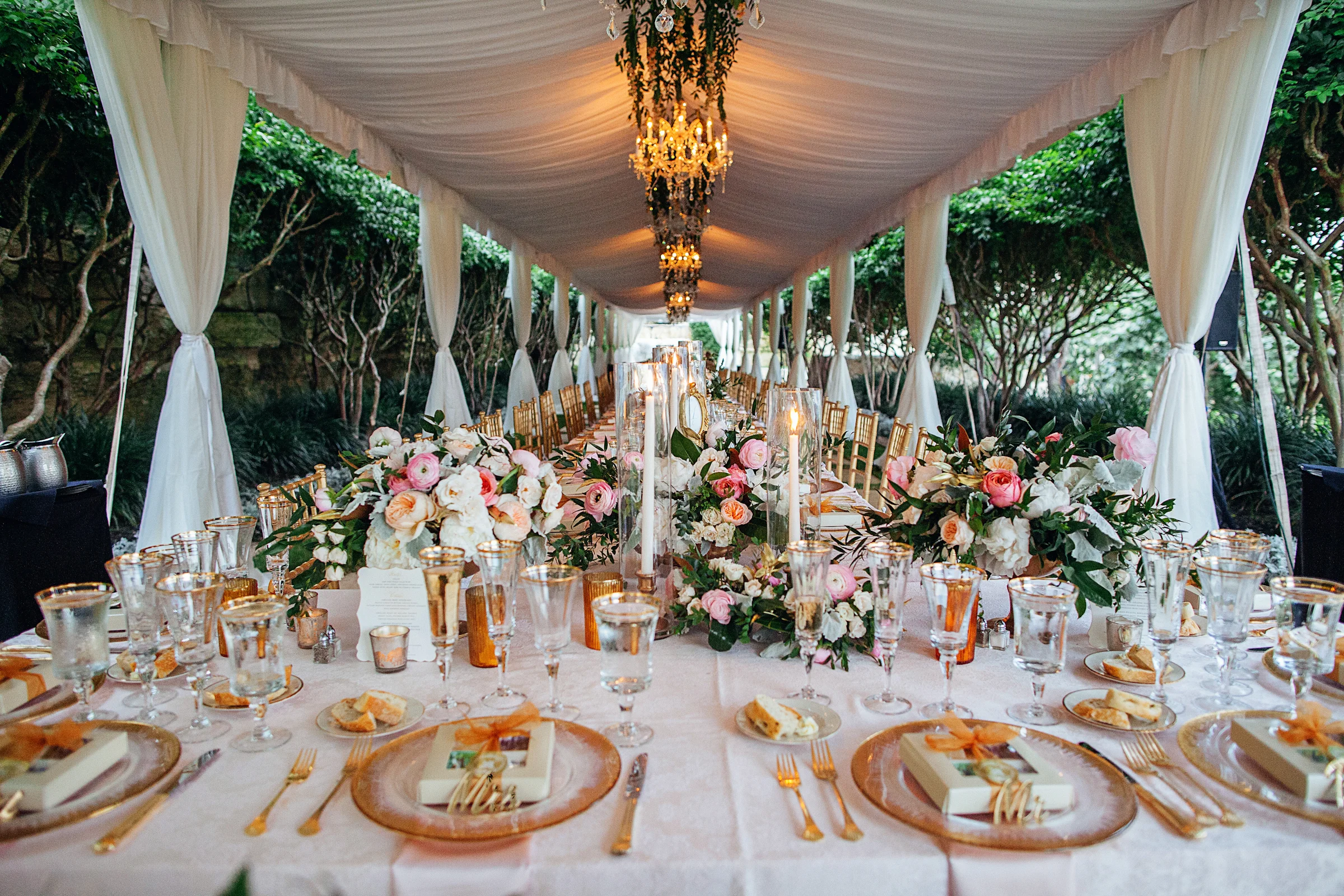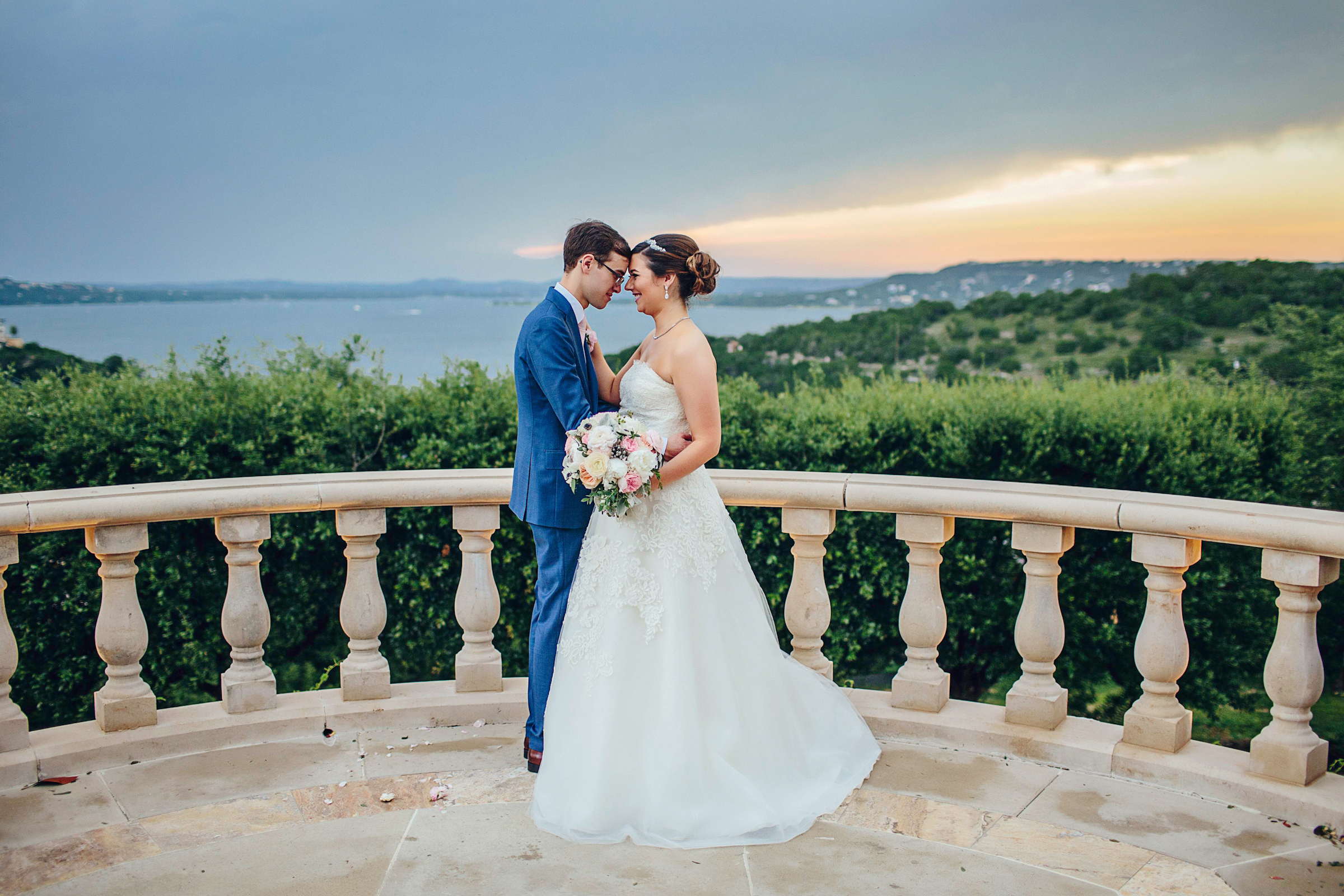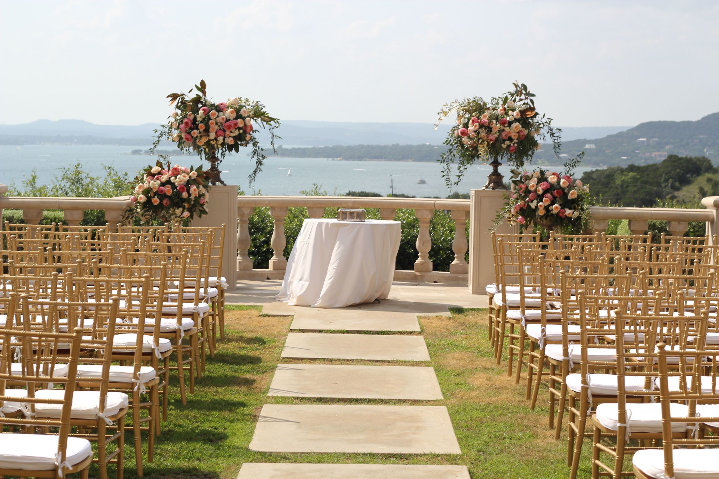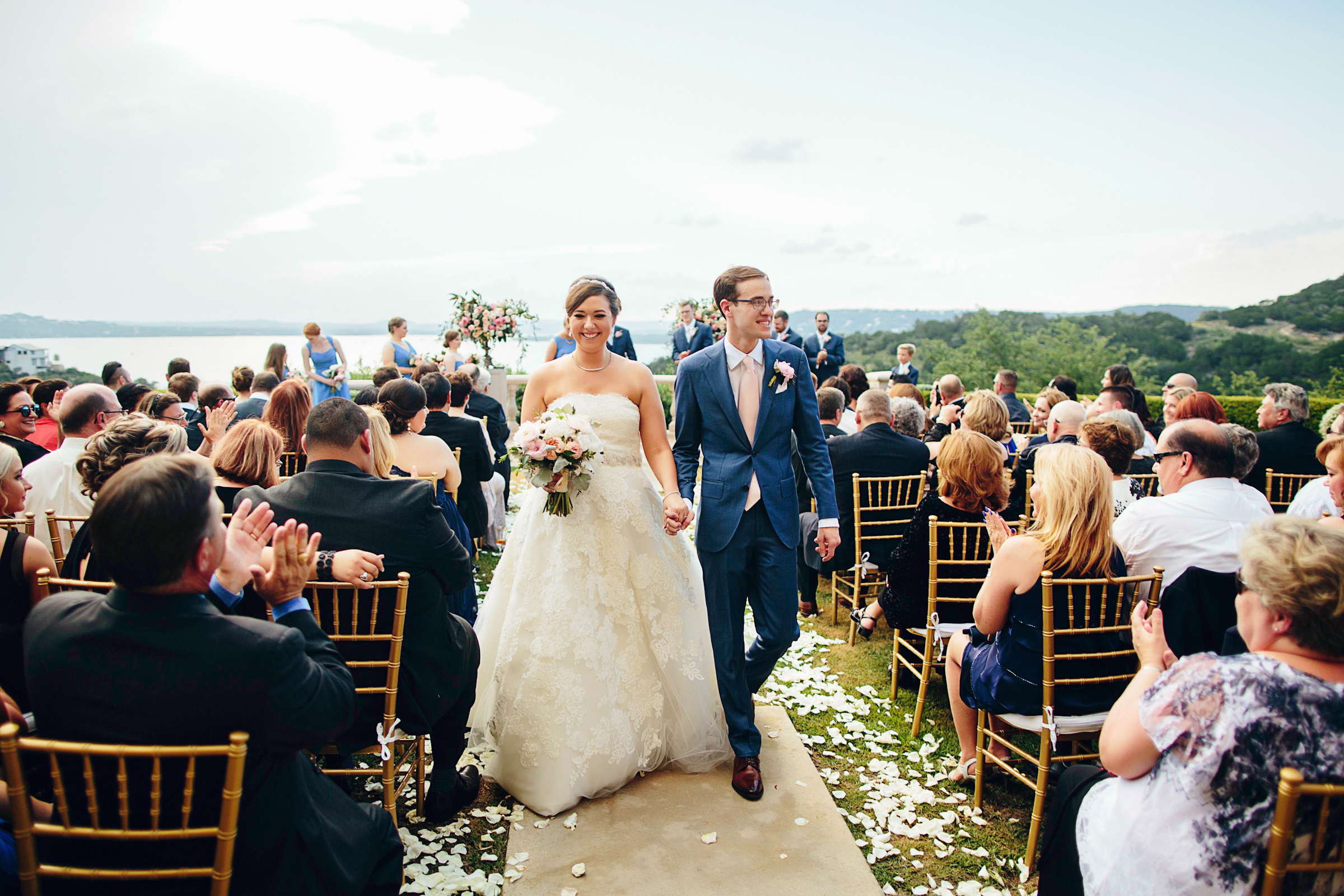 A stunning, cliffside ceremony followed by a serene sunset and wow-factor fire works to close the night. Meredith + Michael's wedding was elegant, over-the-top and crazy romantic. Fluffy peonies and garden roses in peach and coral hues added extravagant detail throughout the design, meeting greenery and taper candles for a vibe that read striking garden party in the heart of Texas lake country.